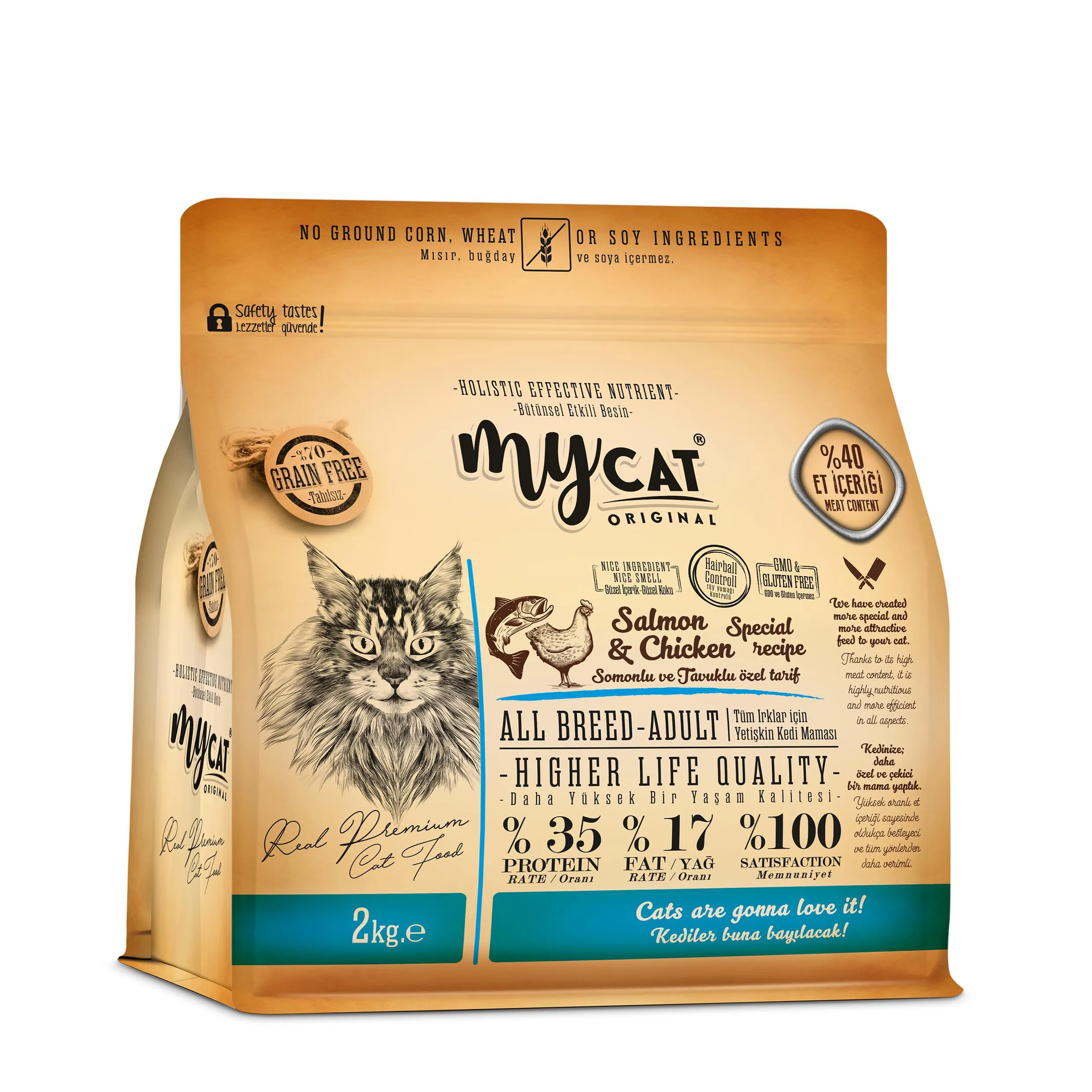 -ÜRÜN ÖZELLİKLERİ- MyCat Original Az Tahıllı Somon Balıklı ve Tavuk Etli Yetişkin Kedi Maması 2kg AZ TAHILLI SOMON BALIK VE TAVUK ETLİ YETİŞKİN TÜM KEDİLERE DAHA YÜKSEK YAŞAM KALİTESİ SAĞLAMAK İÇİN TASARLANMIŞTIR. PROTEİN %32 FAT / YAĞ %15 %100 MEMNUNİYET (PREMİUM İÇERİĞİ İLE YÜKSEK YAŞAM KALİTESİ SUNAR) KEDİ AĞIRLIĞI KG 2 3 4 5 6 7 8 9 10 GÜNLÜK PORSİYON GR 29-32 32-43 43-54 54-63 63-73 73-82 82-90 90-99 99-107 Somonlu ve Tavuklu Özel Tarif : Tüm Irklar için Yetişkin Kedi Maması Somon balığı ve yağı ile beraberinde tüylerin daha parlak ve canlı olmasında yardımcı olurken protein ve taurin değeri yüksektir. İçindekiler: Kurutulmuş ve Taze Somon-Tavuk (%40), (kurutulmuş %30, taze %10) Esmer pirinç, Bezelye, Nohut, Patates, Yeşil Mercimek, Tavuk Yağı, Bira Mayası, Balık Yağı, Kurutulmuş Şeker Pancarı, Bal Kabağı, Karahindiba, Yaban Mersini, Keten Tohumu, Kızılcık, Probiyotikler, Harnup, Yucca, Pisilyum, Nükleotit Maya Proteini, Vitamin ve Mineraller. Besleyici İlaveler: Vitamin A (3a672a), Vitamin D3(3a671), Vitamin E (3a700), Vitamin C (3a300), Vitamin B1 (3a821), B2 ( 3a825i), B3 (Niasin-3a315), B6 (3a831), B12 (3A), B7 (Biotin-3a880), B9 (Folik Asit-3a316), Vitamin K3 (3a710), Kolin (3a890), Kalsiyum Pantotenat (3a841). Mineraller: Demir(3b103), İyot (3b202), Bakır(3b405), Manganez (3b502), Çinko(3b603), Selenyum(3b802). Yeni Mamaya Geçiş Süreci Evcil hayvanların sindirim sisteminin sağlıklı şekilde uyum sağlayabilmesi için, mama değişimi kademeli olarak yapılmalıdır. Ani geçişler mide ve bağırsak problemlerine yol açabilir. Yeni mamaya geçiş süreci, 7-10 gün boyunca eski ve yeni mamanın karıştırılarak verilmesiyle tamamlanmalıdır. Bu süreçte ev yemeği eklenmemeli, sadece kuru mama kullanılmalıdır. Mama seçiciliği olan hayvanlar için, yeni mama elde sunularak alışma süreci desteklenebilir. Geçiş boyunca hayvanın dışkı yapısı, enerji seviyesi ve genel durumu gözlemlenmeli; herhangi bir olumsuz durumda veteriner hekime danışılmalıdır. Geçiş Planı: 1–3. Gün: %25 yeni mama, %eski 75 eski mama 4–6. Gün: %50 yeni mama, %50 mama 7–9. Gün: %75 yeni mama, %25 eski mama 10. Gün ve sonrası: %100 yeni mama