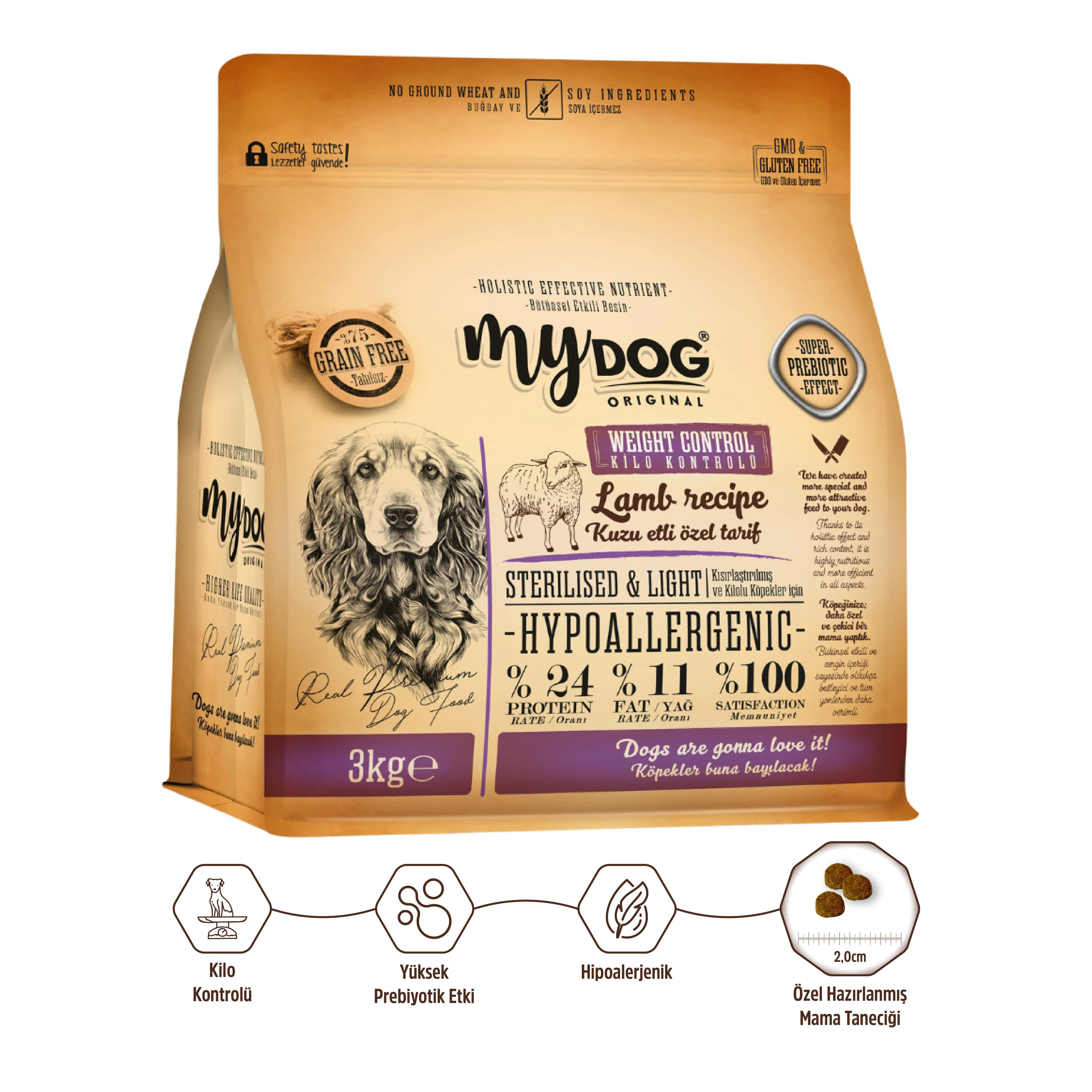 -ÜRÜN ÖZELLİKLERİ- MyDog Original Az Tahıllı Kuzu Etli Diyet & Kısır Köpek Maması 3kg AZ TAHILLI KUZU ETLİ DİYET TÜM KISIR KÖPEKLERE DAHA YÜKSEK YAŞAM KALİTESİ SAĞLAMAK İÇİN TASARLANMIŞTIR. HYPOALLERGENICTİR ( HASSAS ALERJİYE SAHİP KÖPEKLER KULLANABİLİR) PROTEİN %24 FAT/YAĞ 11 %100 MEMNUNİYET (PREMİUM İÇERİĞİ İLE YÜKSEK YAŞAM KALİTESİ SUNAR) KÖPEK AĞIRLIĞI KG 12 15 20 25 30 35 40 45 50 GÜNLÜK PORSİYON GR 150-200 200-250 250-300 300-360 350-470 440-535 490-590 530-630 590-690 Kuzu etli özel tarif, kısır ve fazla kilolu köpeklere daha yüksek bir yaşam kalitesi sağlamak için tasarlanmıştır. İçeriğinde köpeklerin ihtiyaç duyduğu tüm besinsel bileşenleri aynı tarifte toplamayı hedefleyerek, 'Bütünsel Etkili Besin' kavramını oluşturduk. Doğru beslenme ile birlikte mükemmel bir lezzet deneyimi sunmak için en üst sınıf hammaddeleri kullandık. Yüksek protein ve düşük yağlı içeriği ile kısırlaştırılmış köpeklerin kilo kontrolünü sağlayarak, sağlıklı ve dengeli bir beslenme deneyimi sunar. İçindekiler: İşlenmiş Kuzu Proteini (%20), Pirinç, Mısır, Hidrolize Kuzu Proteini (%16), Tavuk Yağı, Kurutulmuş Şeker Pancarı, Harnup, Bira Mayası, Hidrolize Tavuk Ciğeri, Hamsi Yağı, İşlenmiş Balık Proteini, Nükleotit Maya Proteini, Mineraller, Prebiyotik Mannan Oligo Sakkaritler, Deniz Yosunu, Yaban Mersini Tozu, Avizeağacı Özütü, Pisilyum, Kadife Çiçeği Tozu. Besleyici İlaveler: Vitamin A (3a672a), Vitamin D3 (3a671), Vitamin E (3a700), Vitamin C (3a300), Taurine (3a370), Vitamin B1 (3a821), Vitamin B2 (3a825i), Vitamin B3 (3a315 Niacin), Vitamin B6 (3a831), Vitamin B12 (3a835), Vitamin B7 (3a880 Biotin), Vitamin B9 (3a316 Folic acid), Vitamin K3 (3a710), Calcium D-Pantothenate (3a841), Calcium (11.1.1), Phosphorus (11.3. 1), Zinc (3b603), Copper (3b405), Iron (3b103), Sodium (11.4.2), Organic Selenium (3b801), Iodine (3b202), Glukozamin 1200 mg/kg, Kontroitin 800 mg/kg, Omega 6 %3.4, Omega 3 %0.7, Yeni Mamaya Geçiş Süreci Evcil hayvanların sindirim sisteminin sağlıklı şekilde uyum sağlayabilmesi için, mama değişimi kademeli olarak yapılmalıdır. Ani geçişler mide ve bağırsak problemlerine yol açabilir. Yeni mamaya geçiş süreci, 7-10 gün boyunca eski ve yeni mamanın karıştırılarak verilmesiyle tamamlanmalıdır. Bu süreçte ev yemeği eklenmemeli, sadece kuru mama kullanılmalıdır. Mama seçiciliği olan hayvanlar için, yeni mama elde sunularak alışma süreci desteklenebilir. Geçiş boyunca hayvanın dışkı yapısı, enerji seviyesi ve genel durumu gözlemlenmeli; herhangi bir olumsuz durumda veteriner hekime danışılmalıdır. Geçiş Planı: 1–3. Gün: %25 yeni mama, %eski 75 eski mama 4–6. Gün: %50 yeni mama, %50 mama 7–9. Gün: %75 yeni mama, %25 eski mama 10. Gün ve sonrası: %100 yeni mama